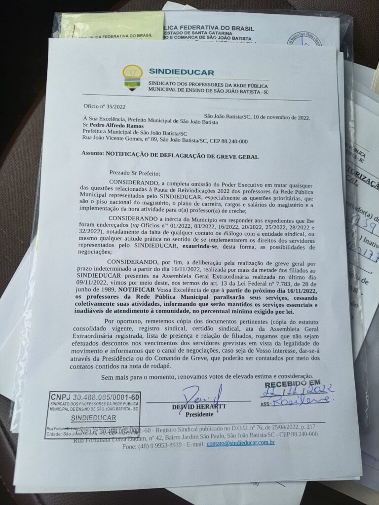 Assunto: NOTIFICAÇÃO DE DEFLAGRAÇÃO DE GREVE GERAL Prezado Sr Prefeito; CONSIDERANDO, a completa omissão do Poder Executivo em tratar quaisquer das questões relacionadas à Pauta de Reivindicações 2022 dos professores da Rede Pública Municipal representados pelo SINDIEDUCAR, especialmente as questões prioritárias, que são o piso nacional do magistério, o plano de carreira, cargos e salários […]